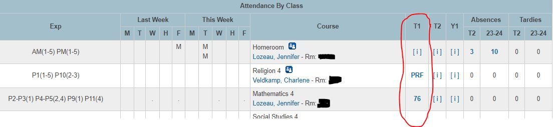 If you would like to see the assignments and assignment comments for each specific course, you can do that by clicking on the number or letter under the T1 column on the first page when you gain access to PowerSchool.