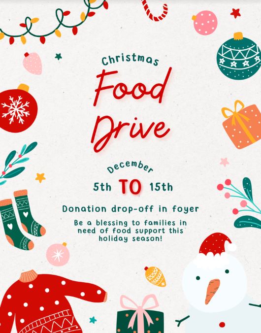 Help support the CCS Christmas Food Drive by donating December 5-15! Donations can be brought to the foyer and don’t forget to grab a candy cane off the tree when you donate! If we meet our school-wide goal of 400 pounds of donations, someone from each class will get the pleasure of silly stringing Mr. Simmons at Celebration! Thanks for your support for our local Food Bank!