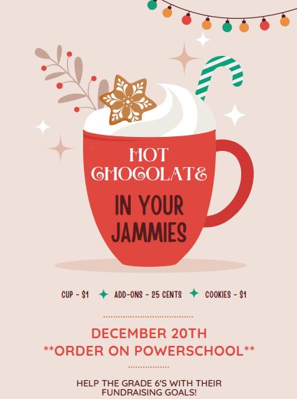 For our first fundraiser, we are bringing back “Hot Chocolate in your Jammies” for Christmas PJ Day on Wednesday, December 20th. Students can order a cup of hot chocolate for $1, add-ons for 25 cents each. In addition, Bon Ton Bakery has agreed to help us out, and students can also order a Gingerbread cookie! Orders need to be placed on PowerSchool before December 13. Please note, that we are limiting orders to one hot chocolate and one cookie per person.