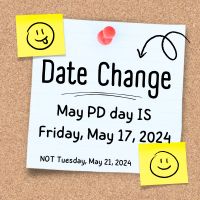 There was a change of dates to the May calendar AFTER our school magnets were printed for the year. Please be aware that the PD day in May IS on Friday, May 17, NOT Tuesday, May 21.