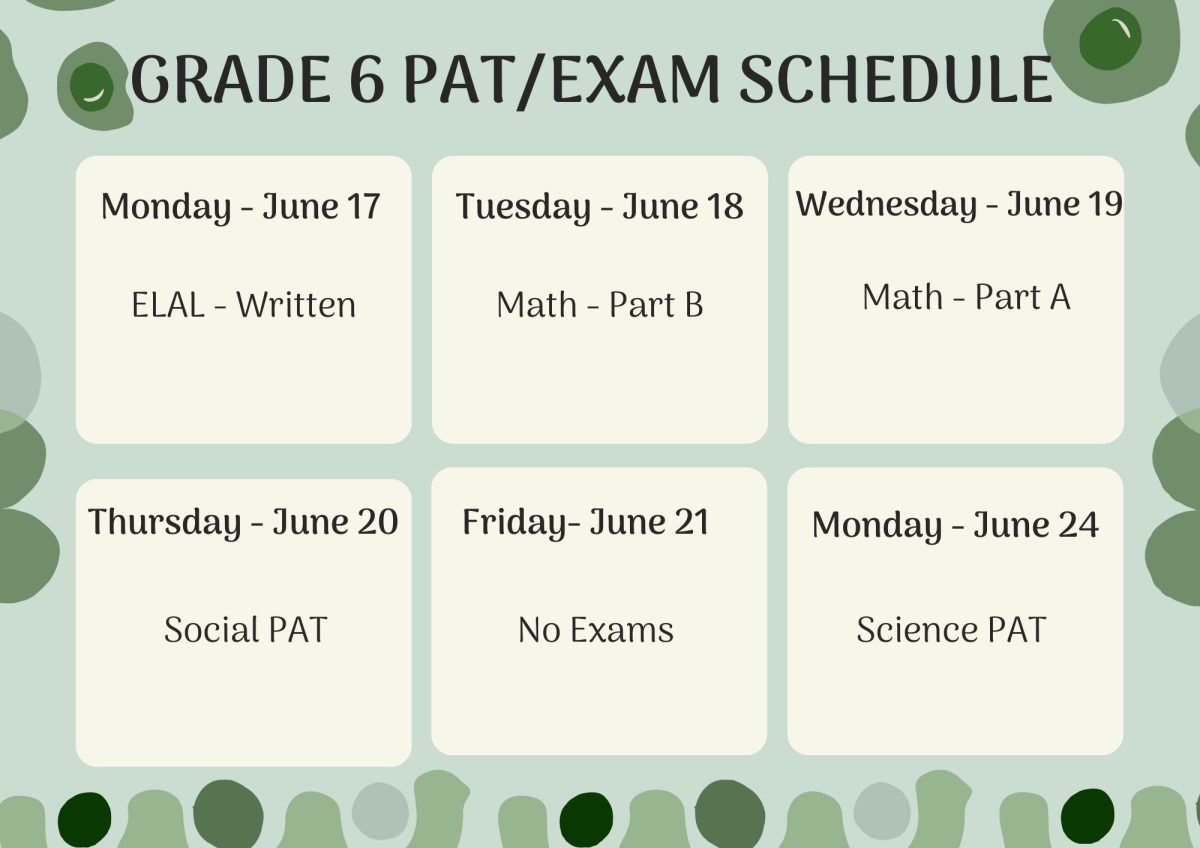 Grade 6 students will begin writing PAT/Exams at 9:00 am each day. They will have regular classes following their exams.