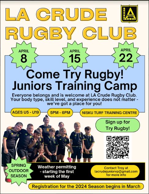 My name is Lauren Oscapella and I am the President of the LA Crude Rugby Club in Leduc AB. As an effort to grow the wonderful sport of rugby in our broader community, we are hosting 3 free TRY RUGBY sessions in April for ages U5-U18. The U5-U11 divisions are non-contact with a focus on games and skill development. No experience is necessary for any age group.