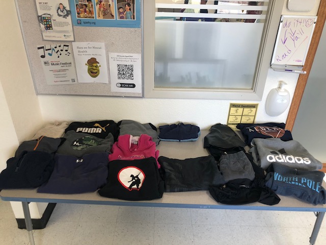 We will post weekly pictures of our lost and found. If you see something that is your child’s, please have them stop by the table and pick it up or let the office know.