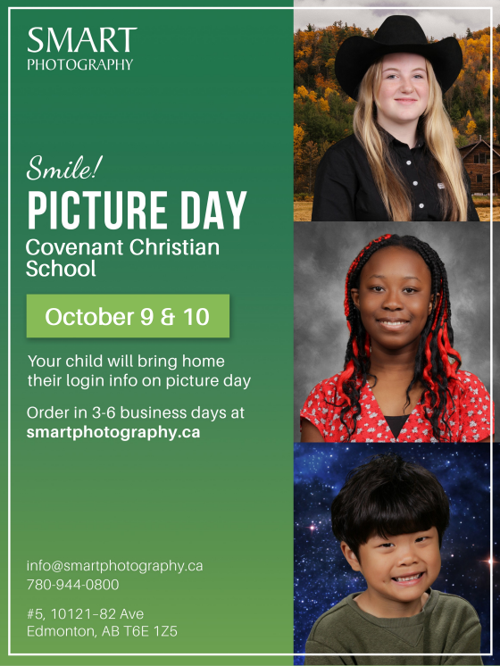 Today and Thursday, our students have picture day! We are using a new company this year, SMART Photography, and are excited about the possibilities this brings for our students and parents! As an Edmonton based company, we look forward to a close connection with our photographers.